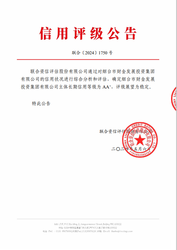 5月6日,經國內專業(yè)評級機構聯(lián)合資信評估股份有限公司綜合分析評定,煙臺財金集團主體信用評級成功由“AA”上調至“AA+”,評級展望為“穩(wěn)定”。