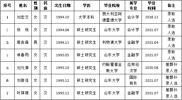 按照2020年11月27日發(fā)布的《煙臺財(cái)金集團(tuán)關(guān)于面向“雙一流”和全球TOP200高校畢業(yè)生公開招聘事項(xiàng)調(diào)整的公告》相關(guān)規(guī)定,經(jīng)過簡歷收集、資格審查、初試、復(fù)試、集體決策等環(huán)節(jié),擬確定錄取人選(詳見下表),現(xiàn)予以公示,公示期為5個工作日(12月22日至12月29日)。公示期間如有異議,請與煙臺市財(cái)金發(fā)展投資集團(tuán)有限公司聯(lián)系,電話:0535-6887160。